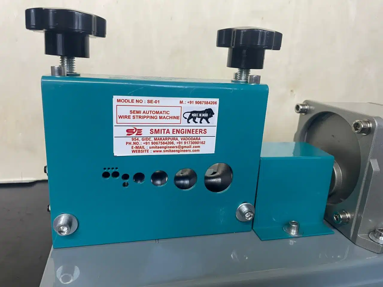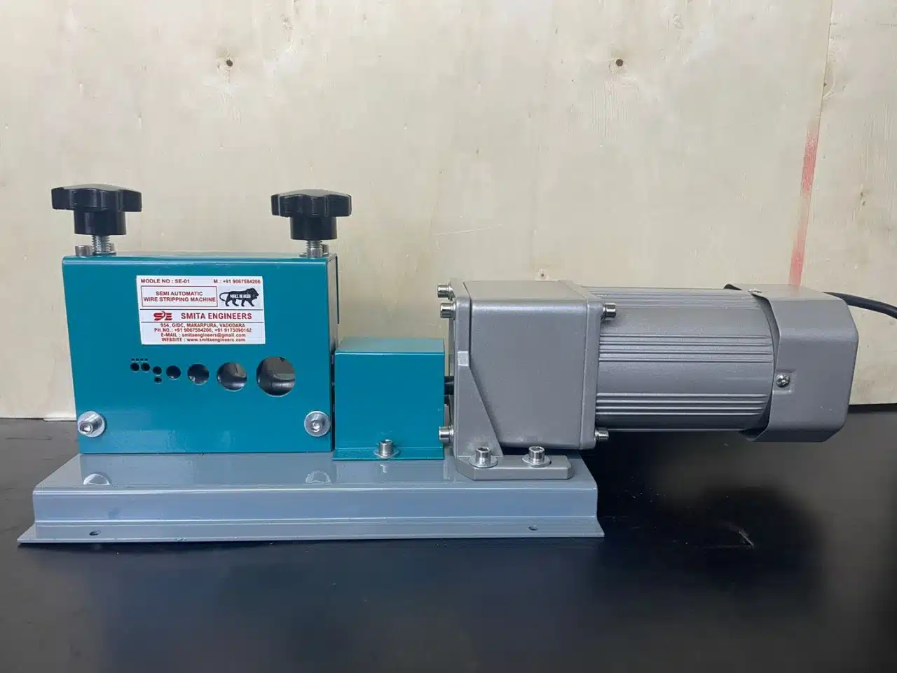 The Semi Automatic Wire Stripping Machine (Model SE01) is a compact and efficient solution designed for accurate stripping of electrical wires and cables. Built with a durable gear-driven mechanism and motorized feed system, this machine ensures smooth operation and consistent performance across various wire sizes.
